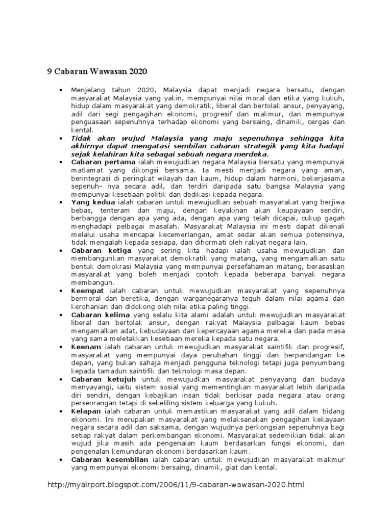 Diperkenalkan pada 28 februari 1991. Mahathir semasa mesyuarat majlis perdagangan malaysia pada 28 februari 1991. Cabaran ke arah universiti bertaraf dunia. Learn vocabulary, terms and more with flashcards, games and other study tools. Wawasan 2020 mengandungi sembilan cabaran yang merangkumi semua aspek kehidupan daripada segi moral, ekonomi, politik dan sosial.